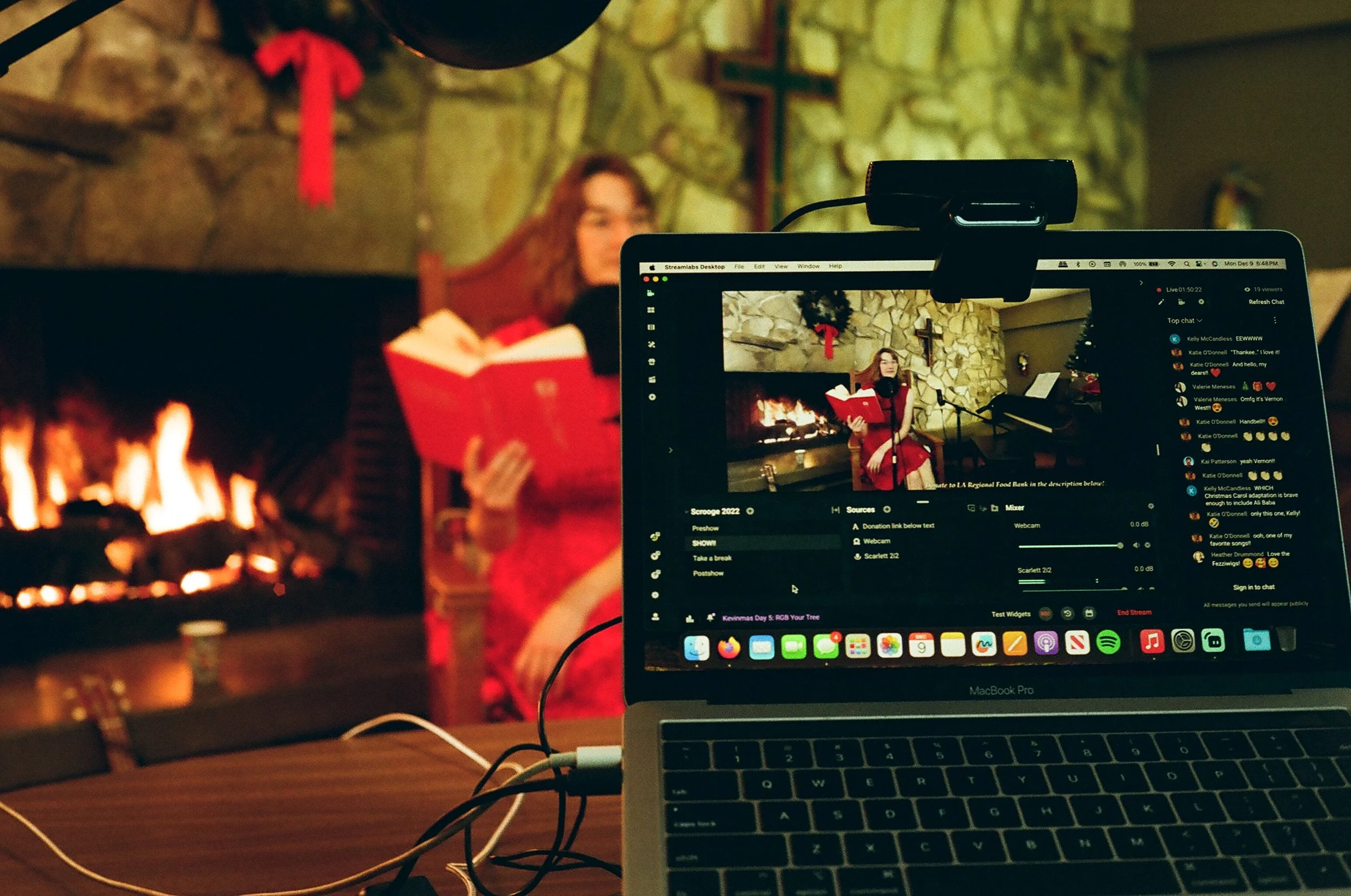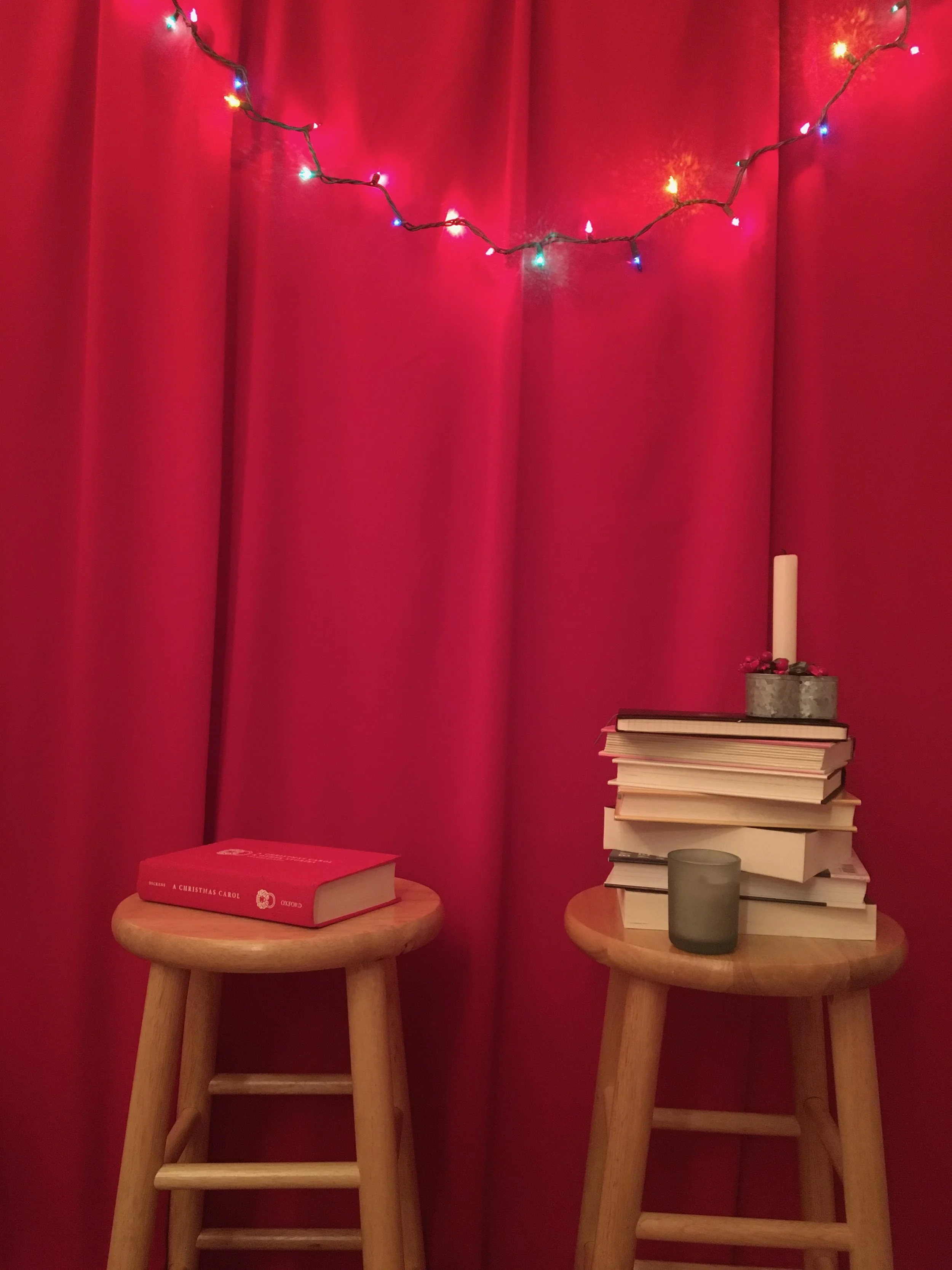 In December 2019, I was a broke restaurant host living in New York City, away from my friends and family for the first time. I needed something to connect me with home on Christmas Eve, so I bought a beautiful red copy of A Christmas Carol, rigged up a red bedsheet and a string of multicolored lights, and read the book front-to-back with three original songs on livestream. Character voices and all. (Of course I thought it would take around two hours and it took five, but that meant I got to finish it Christmas morning.) Lots of people loved it!